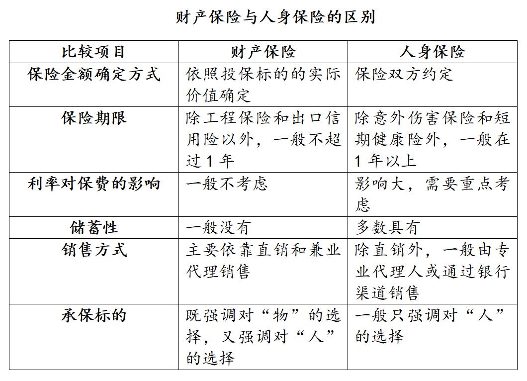 下表总结了常见的人身保险和财产保险的区别。我国法律规定,人寿保险公司只能经营人身保险,不得经营财产险;财产保险公司可以经营短期健康险和意外险。