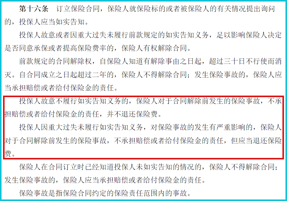 投保时,投、被保人秉承最大诚信原则对“健康告知”问询的事项如实告知,这样理赔才能更顺利。我国《保险法》第十六条有明确规定:投保人故意未如实告知,拒赔、解约、不退还保险费;因重大过失未如实告知,拒赔、解约、退还保险费。